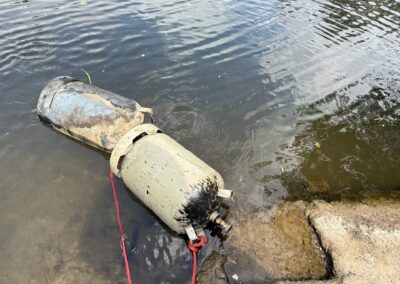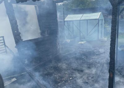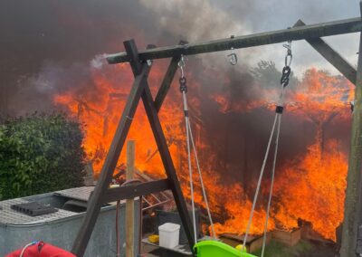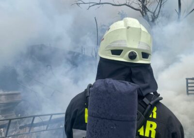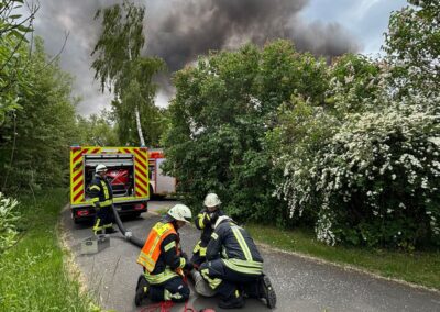 Sechs Trupps unter Atemschutz bekämpften mit drei C-Rohren das Feuer. Eine besondere Gefahr stellten die Gasflaschen dar, die wir in den brennenden Hütten fanden. Diese wurden von uns gekühlt, wobei uns auch hier die Lahn sehr gut „unterstützte“.