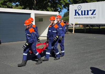 Dabei gingen die Jugendlichen genauso vor, wie die Einsatzabteilungen auch. Sofort nach der ersten Erkundung wurde umfangreich nachalarmiert. Die Jugendfeuerwehren Nauborn und Blasbach, die Jugendgruppe des THW-Wetzlar und der Sanitätszug des Malteser Hilfsdienstes wurde als Verstärkung hinzugezogen, die Einsatzstelle wurde in drei Einsatzabschnitte geteilt und parallel dazu gingen die Jugendlichen in das Gebäude zur Menschenrettung vor. Schläuche wurden rasch ausgerollt, die von den Jugendfeuerwehren selbstgebauten Atemschutzgeräte wurden aufgezogen und erste Verletzte wurden aus dem Gebäude gebracht und an der Verletztensammelstelle an die Kräfte des Malteser Hilfsdienstes übergeben. Die Jugendlichen des THW kümmerten sich um einen unter einem Container eingeklemmten Verletzten. Dieser wurde durch eine Übungspuppe dargestellt. Die übrigen Verletztendarsteller kamen aus den Kinderfeuerwehr Blasbach sowie von der Jugendfeuerwehr aus Schöffengrund. Teamarbeit auf allen Ebenen.