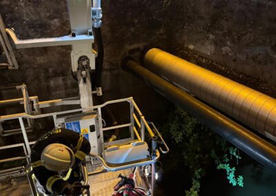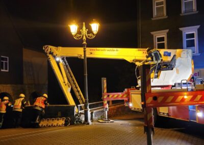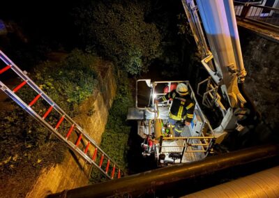 Die Rettung gestaltete sich aufwändig: Nachdem die Person etwa 50m durch das Bachbett getragen werden musste, wurde sie schließlich über den Teleskopmast zurück auf die Straße verbracht.