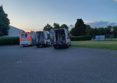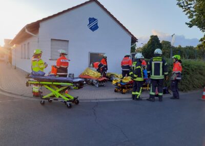 Nachdem 3 Trupps unter Atemschutz die Patienten gerettet hatten wurden sie von Kräften der Malteser Wetzlar und des DRK Rettungsdienst Mittelhessen fiktiv versorgt. Hierfür wurde spontan der Parkplatz am Sportlerheim des RSV Büblingshausen genutzt.